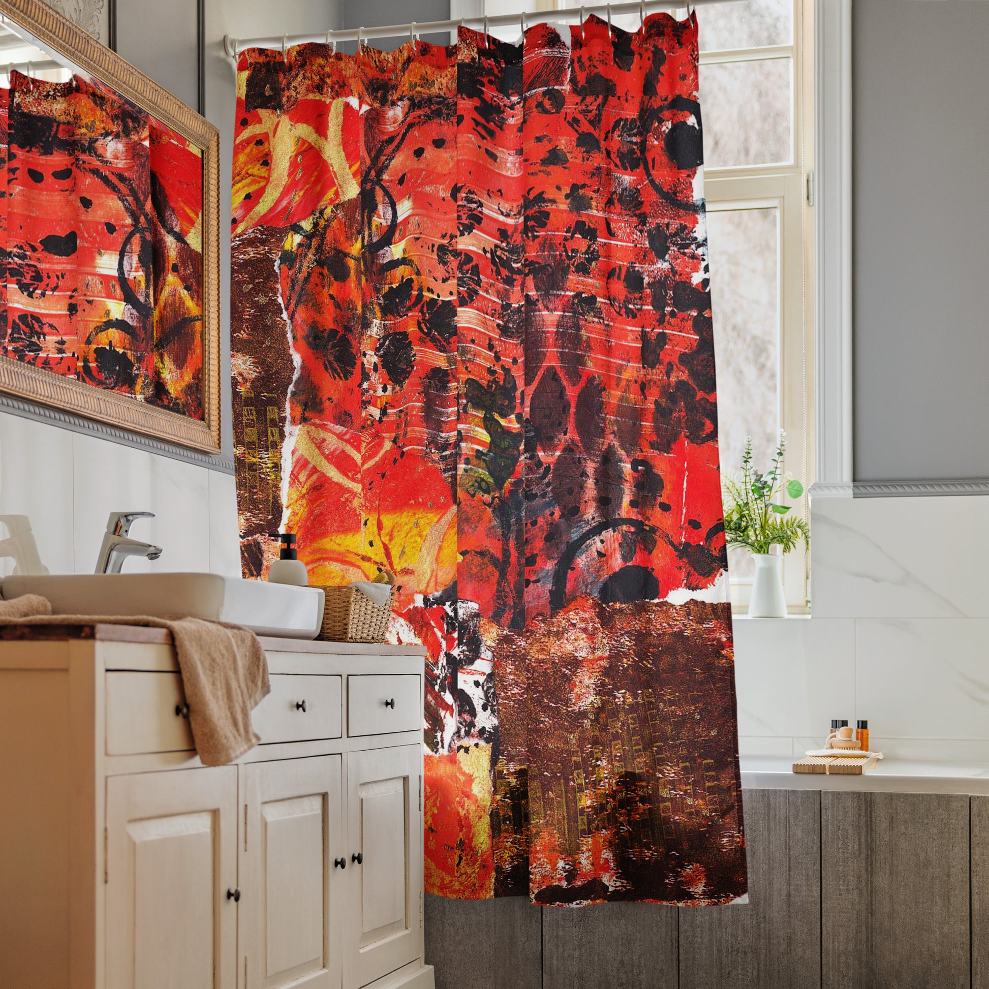 Transform your bathroom with the Love Orange 4 shower curtain. Your bathroom will never look the same. The curtain is durable, water-resistant, and easy to install. Perfect as a housewarming gift or keep it for yourself and create your art forward sanctuary.